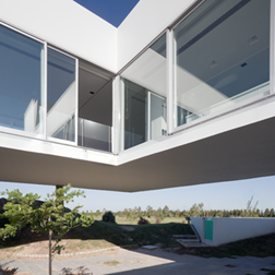 Casa en Kentucky Club de Campo, Funes, Santa Fe - Argentina / Arq. Mariel Suárez Una casa implantada en el borde de un campo de golf. Dos volúmenes de hormigón y vidrio, articulados por un patio interior. Dos plantas desplazadas conectadas por dos escaleras, una en cada intersección, y un ascensor. Dos miradas, una hacia el patio interior en planta baja donde se ubican los dormitorios y el sector de spa, busca una zona de intimidad y reparo, la otra en planta alta, donde se desarrolla la vida social, se abre hacia el campo de golf y utiliza de expansión la losa sobre planta baja. Dos situaciones contrapuestas conviven en este proyecto, la exposición, para poder visualizar el campo de golf, y el reparo, la intimidad, para contar con un lugar protegido, intimista, que brinde privacidad a sus ocupantes. El planteo se apropia de las lomas del paisaje y las incorpora al terreno, protegiendo algunos sectores de la casa de las visuales exteriores y generando accesos a la planta superior a través de terrazas. Dos posibilidades de accesos permiten llegar a la vivienda. La llegada vehicular se produce recorriendo un camino sinuoso a través de un pequeño bosque. En su inicio, la topografía y la forestación impiden ver claramente la casa, ésta empieza a aparecer en el último tramo de esta calle interior. Este recorrido prolonga el tiempo y espacio de llegada a la casa, dándole jerarquía al ingreso. El acceso peatonal se produce subiendo una loma que nos conduce al ingreso principal en planta alta. Durante el ascenso podemos visualizar el golf y asomarnos al patio interior El patio interior le da sentido al proyecto y encuentra sus límites en las fachadas de planta baja, la galería que aparece definiendo el perímetro de la planta alta, las lomas y la piscina. La piscina exterior, un prisma rectangular de hormigón que se encastra en una de las lomas, apoyándose sobre el nivel del patio interior y elevándose 2 m por sobre el mismo. En una de sus caras, se recorta un paño fijo de vidrio transparente que nos permite ver el agua y a su vez actúa como desborde produciendo una especie de cascada que cae en un estanque brindando sonido y frescura al patio interior A diferencia de los planteos compactos, donde la relación entre interior y exterior se evidencia claramente, en este planteo surgen distintas situaciones con diferentes escalas y calidades espaciales, la relación entre interior y exterior va variando según en el lugar de la casa donde nos encontremos. La disposición de los volúmenes y la relación de éstos con las lomas, el patio y las terrazas, genera múltiples recorridos.